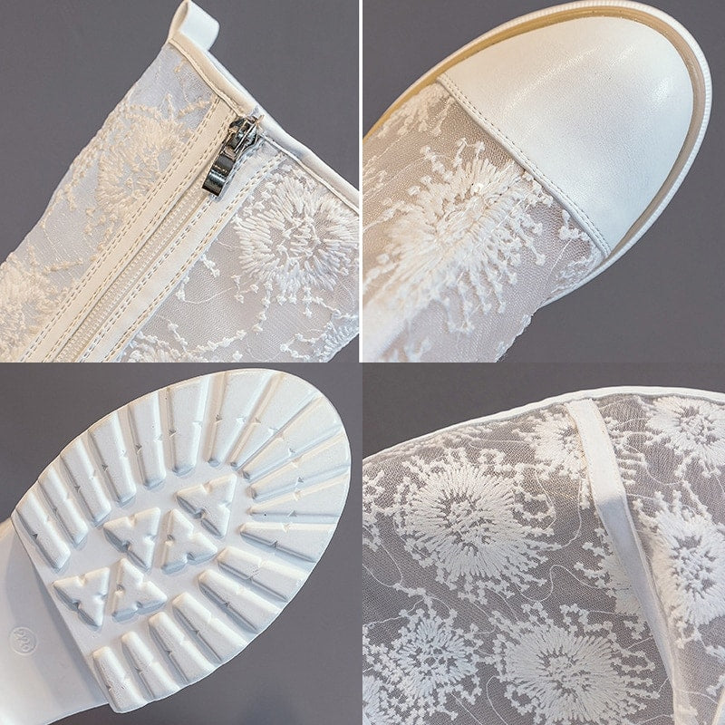 Tyto nádherné vysoké letní boty z bílé krajkové síťoviny jsou dokonalým doplňkem vaší letní outfitu. Jsou zdobeny květinovým vzorem a mají vyvýšenou podrážku, která vám poskytne bezkonkurenční pohodlí. Materiály nejvyšší kvality zaručují dlouhou životnost a vynikající odolnost vůči nepříznivému počasí. Tyto boty jsou navrženy tak, aby se daly nosit po celý den, ať už jdete do práce nebo ven s přáteli. Budete si jisty, že uděláte dojem s těmito elegantními a moderními botami.