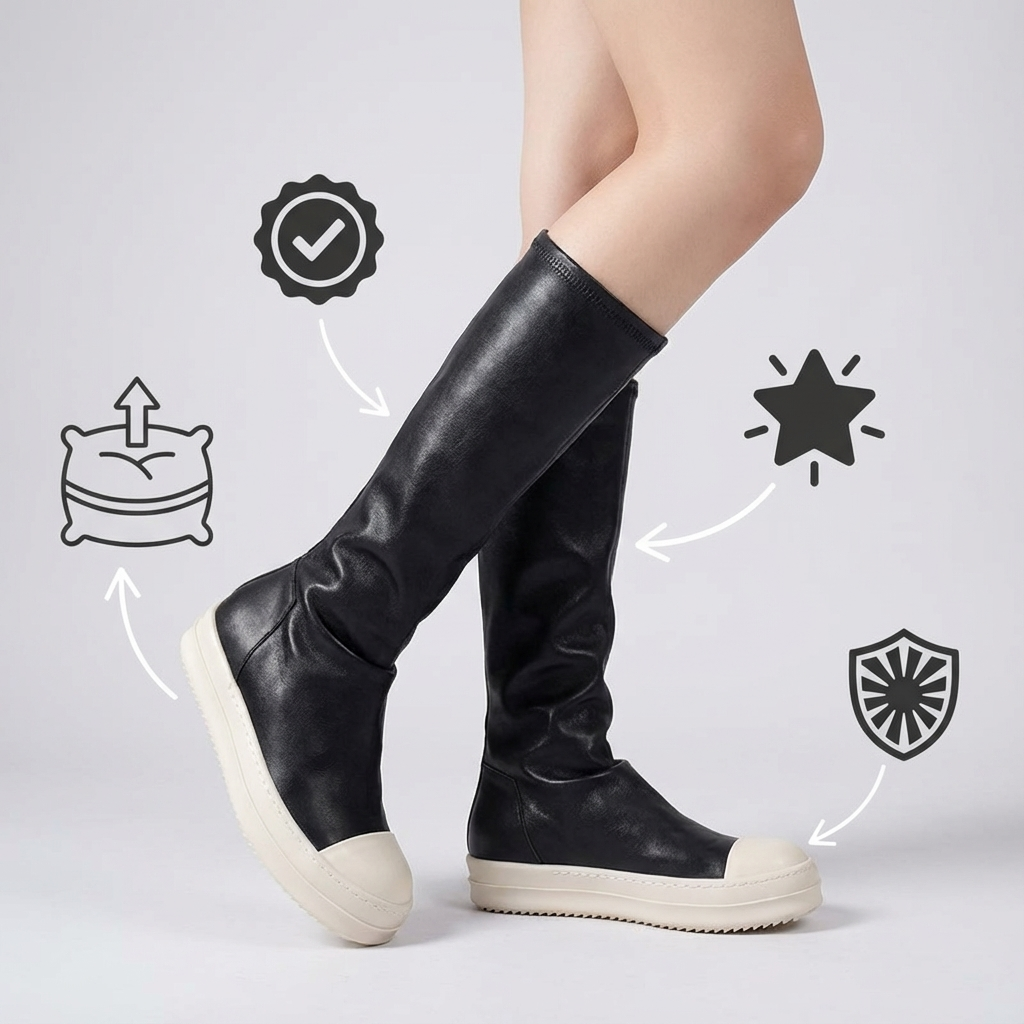 Disse høje platformstøvler er perfekte til at tilføje et strejf af elegance og stil til dit look. Fremstillet af læder af høj kvalitet, er de designet til at tilbyde enestående komfort og holdbarhed. Indersålerne er bløde og åndbare, hvilket gør det muligt for dig at forblive komfortabel hele dagen. Ydersålerne er skridsikre og slidstærke, hvilket sikrer fremragende greb på alle typer overflader.