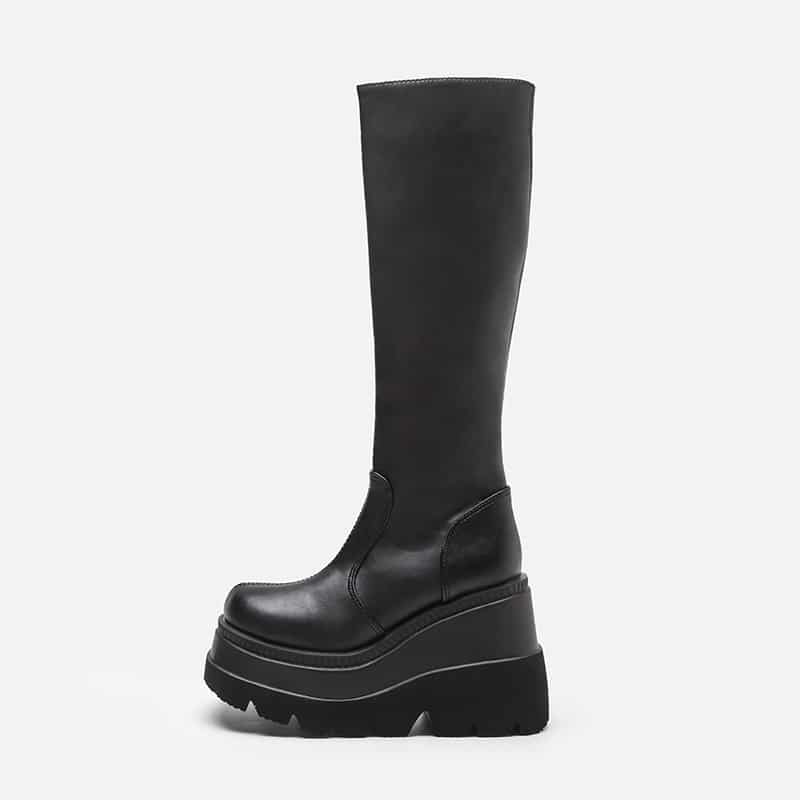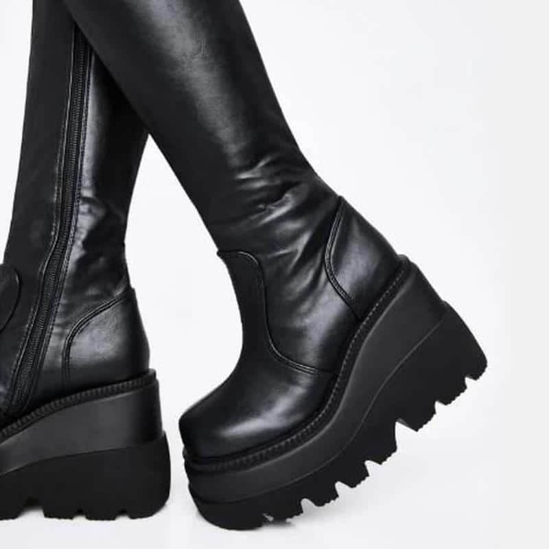 Black leather platform boots with zipper closure