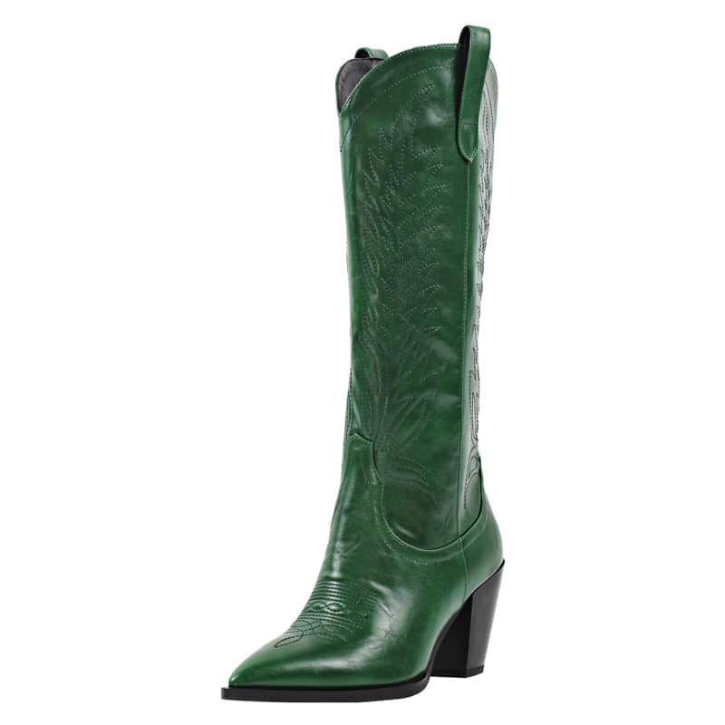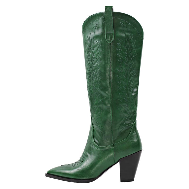 Estas botas cowboy verdes están confeccionadas en piel de alta calidad y son perfectas para añadir un toque de elegancia a tu look. Las botas tienen una altura que protegerá tus pantorrillas, mientras que los detalles les darán un auténtico look cowboy. Las botas están equipadas con un tacón en bloque para una marcha cómoda y la suela está hecha de goma duradera para un agarre confiable.
